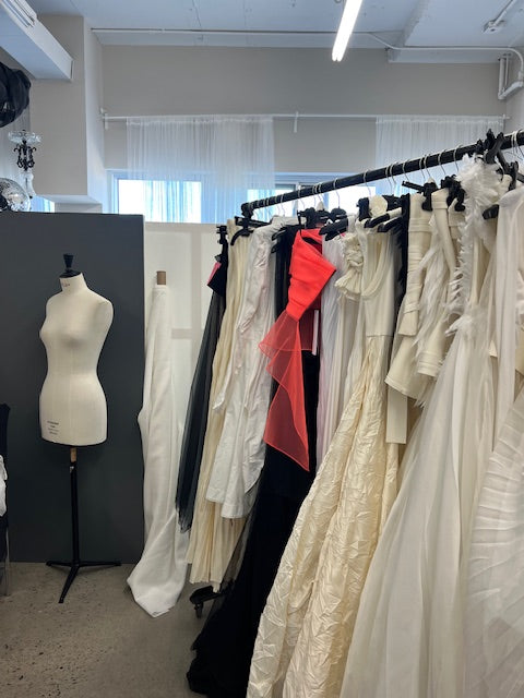 Like every visit to the MSP studio/production/warehouse facility, we started by going to the wrong floor, a ritual ensured by the building’s occupancy list. When we arrived at the right door a few minutes early, Marie provided a quick tour and introduced us to her team: cutters, seamstresses, shippers, and the sales and marketers. By the time we were back at the beginning, a rack and chairs awaited with sample dresses and dozens of components including slips, bustiers, skirts, belts, and tulle petticoats.