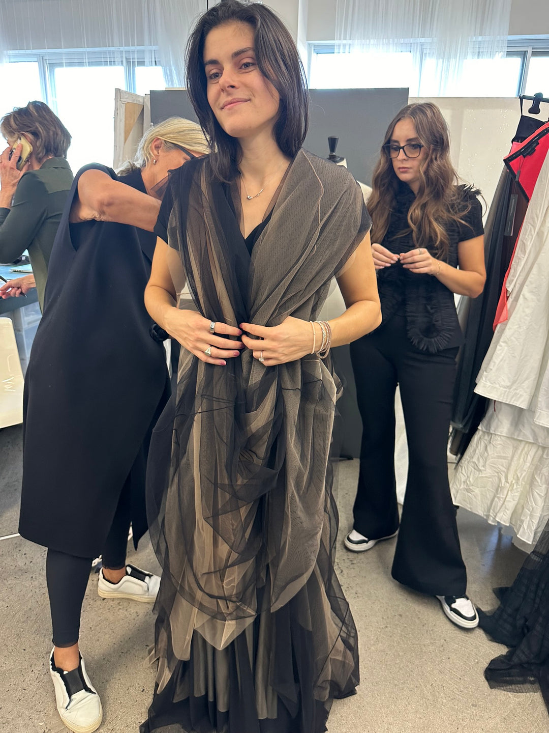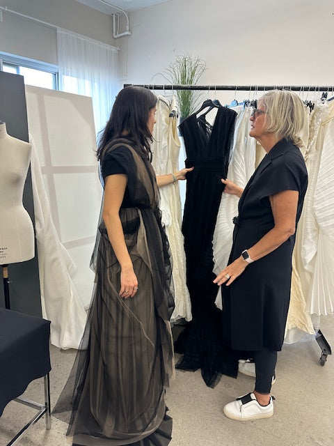 After trying on most of what was on the rack, as well as what Marie pulled in from both future and archived collections, the overall shape and direction were decided. Because so many options appealed, Kit also found what she will wear to the rehearsal dinner.
