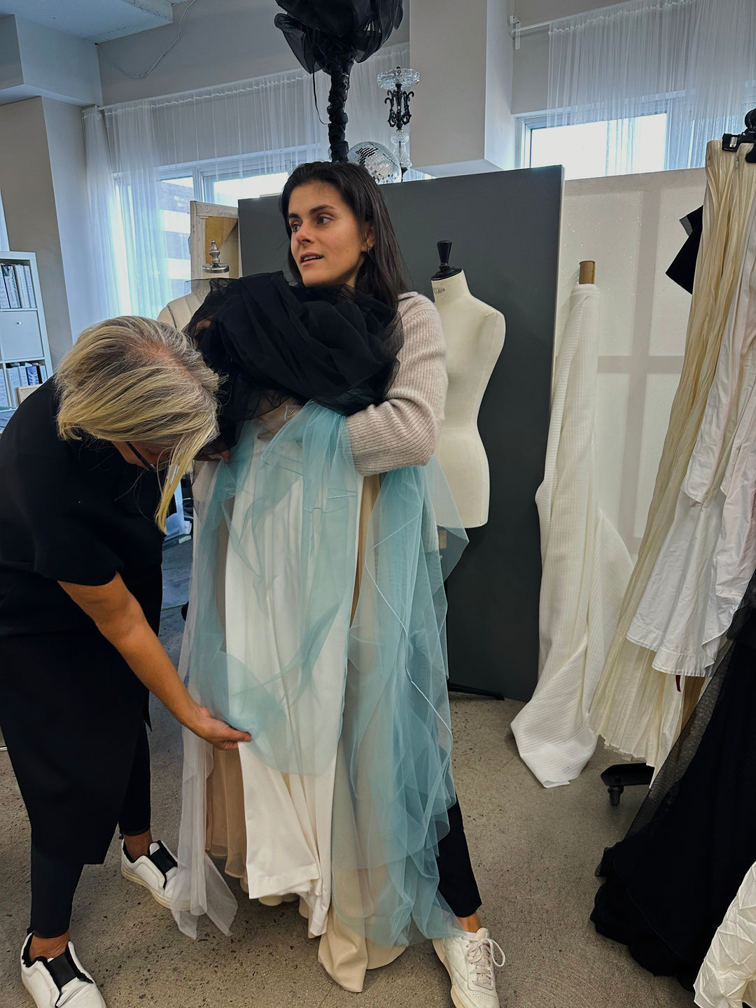 Thirteen years later, Kit, Jacey, who is Princess #2, and I arrived at the Atelier in Montreal nervously regretting not spending even a minute at a real bridal store. Rudimentary online research had yielded just two dresses Kit liked, but what if Marie didn’t have anything either? Would her signature scuba be too hot for an Eastern Shore ceremony? What would the process be like? Would it be possible to flee?