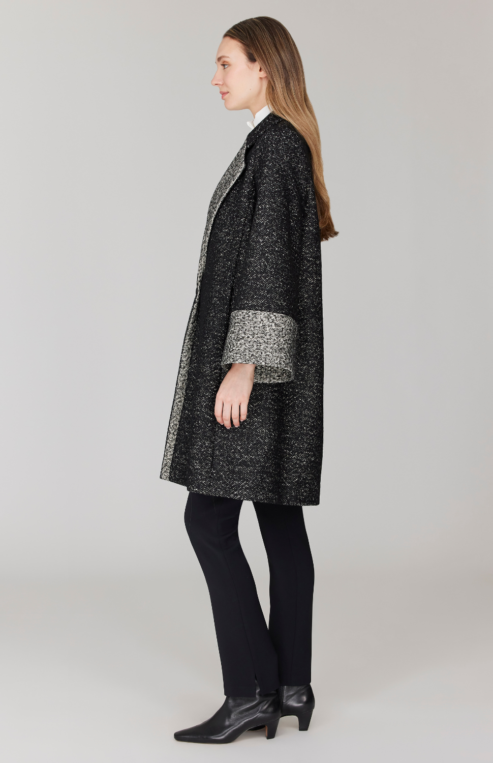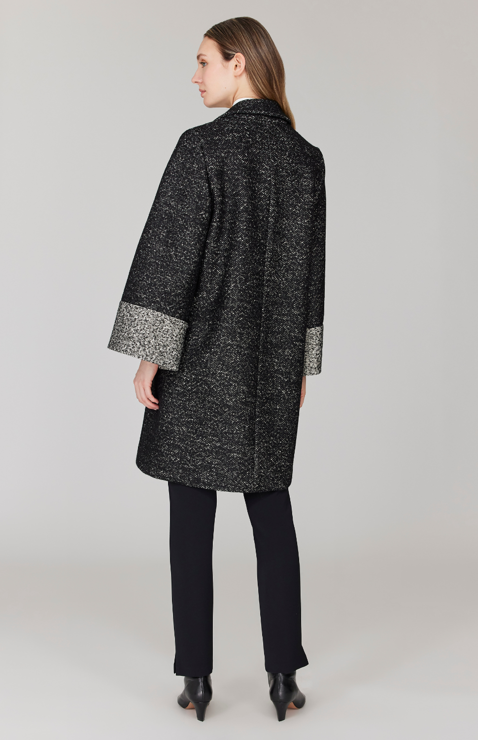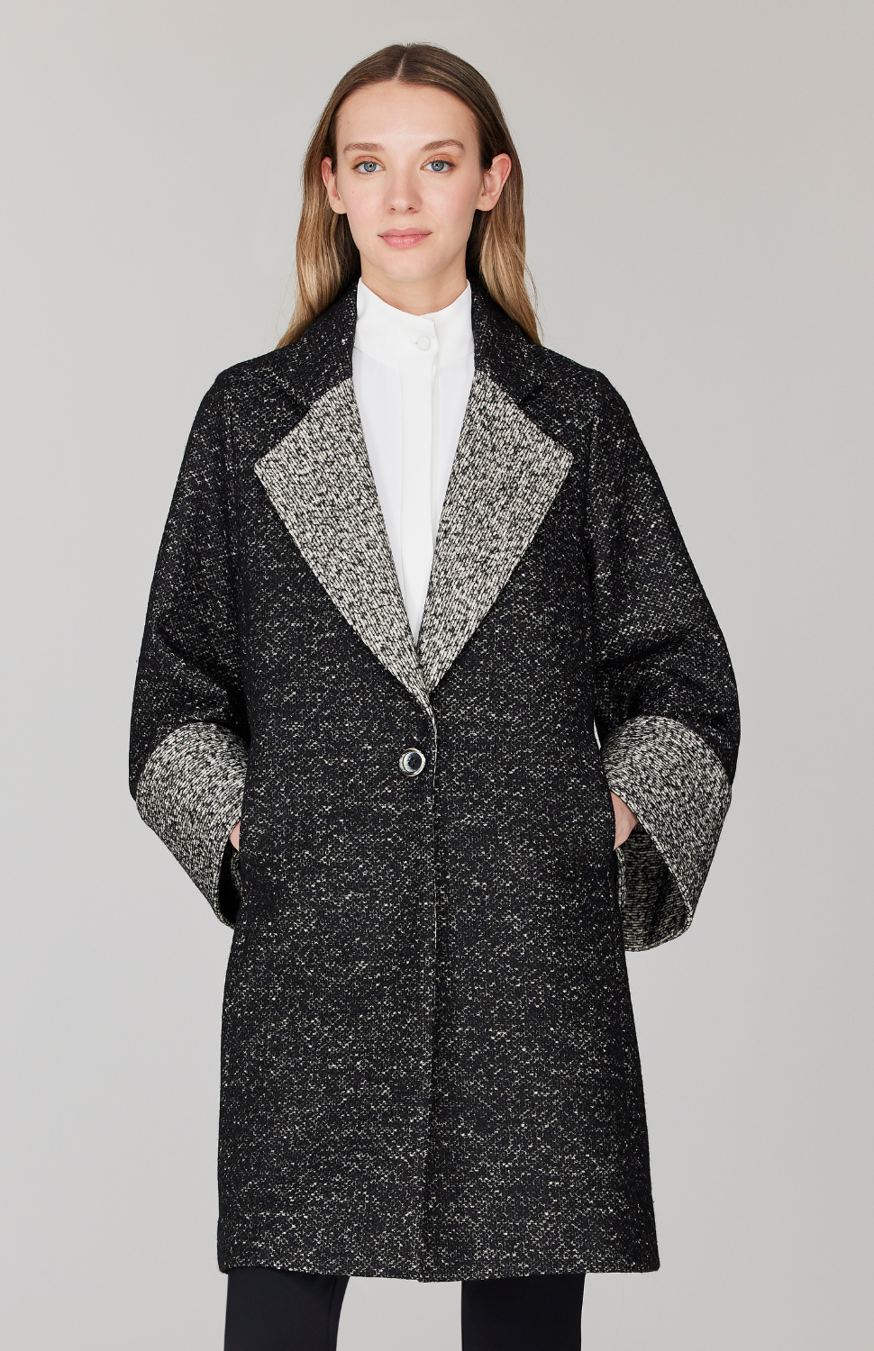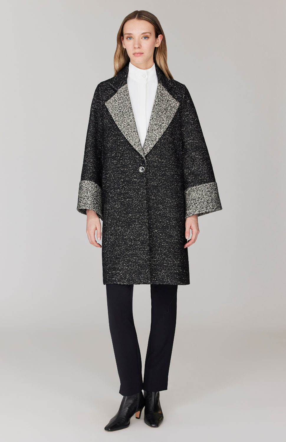 An oversized, A-line coat cut in a versatile cotton and wool blend coating fabric. This jacket has a dramatic notch collar and cuff, highlighted with contrasting reverse self fabric and has a single button closure. This jacket is unlined and has pockets.