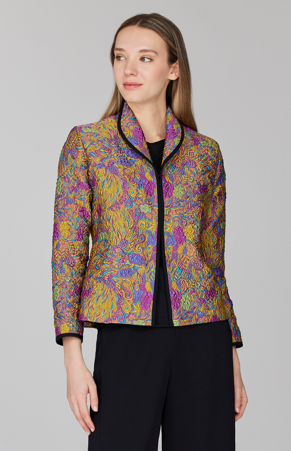 A short fitted jacket with a flattering winged collar that frames the face. This jacket is cut in a whimsical patterned jacquard and is trimmed with black Lustrous Crepe bias. It is unlined, finished with three hook & eye closures.