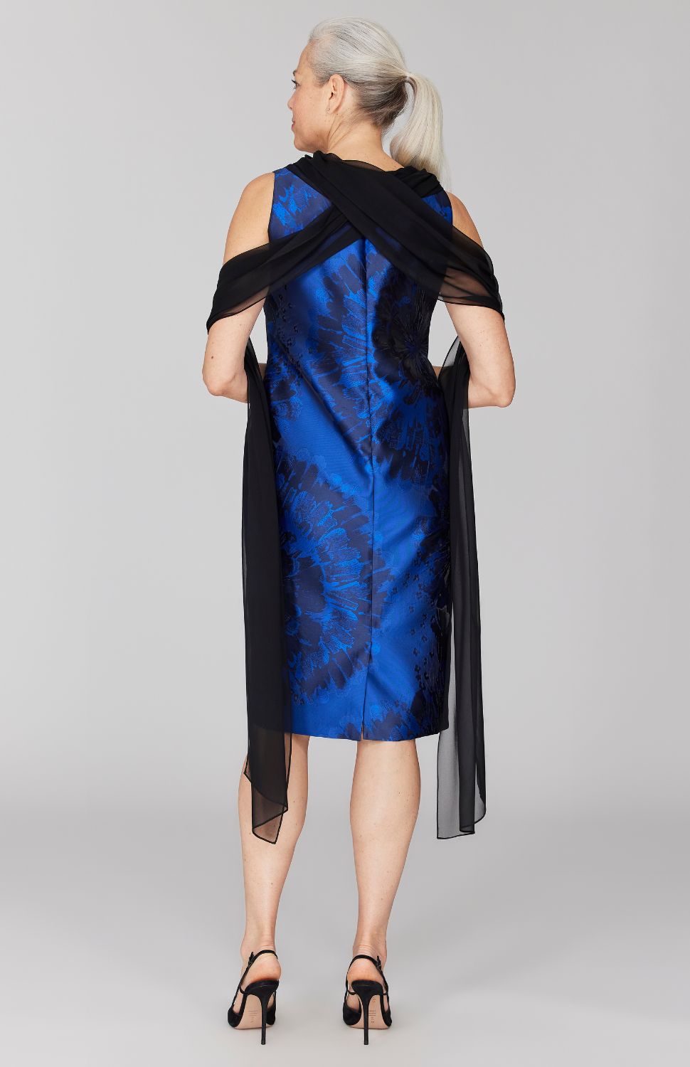 Our signature sheath dress updated in a beautifully patterned organza and detailed with floaty silk chiffon. The draped chiffon scarf offers the perfect amount of drama and movement. This dress is lined and finished with a simple back zip closure.