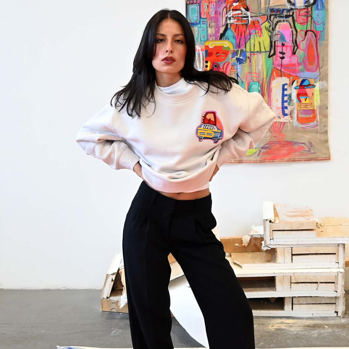 This sweater is designed with five of Isabelle Gougenheim’s embroidered art patches, each one inspired by her original paintings. Every patch is a fragment of her artwork, transformed into a unique and collectible design.