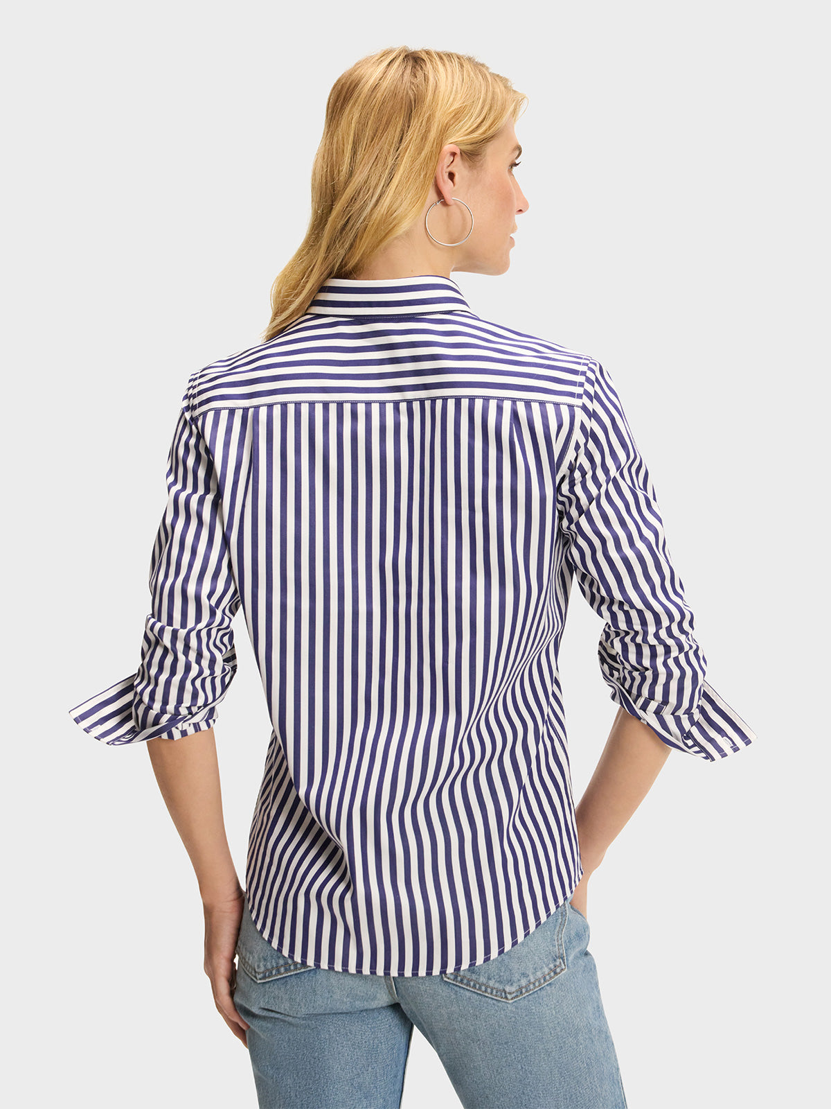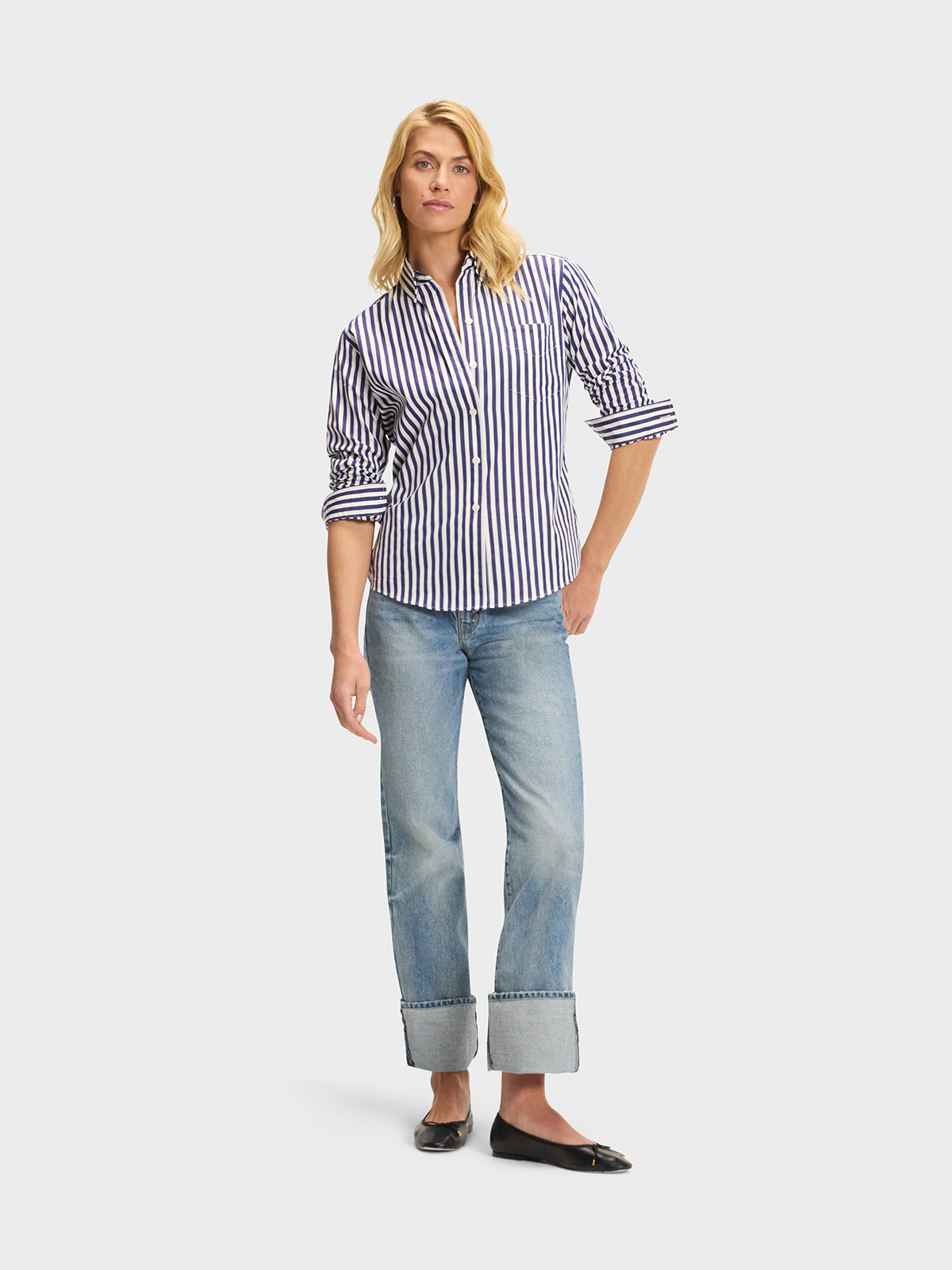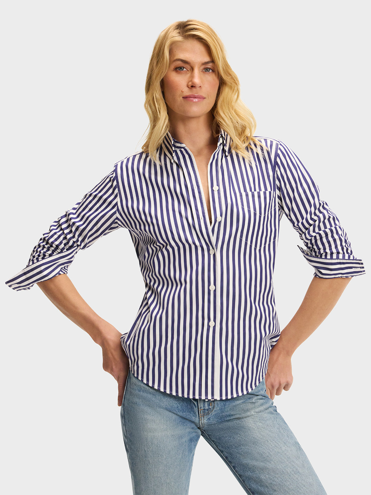 Our menswear-inspired Weekend Shirt in a navy blue and white stripe.