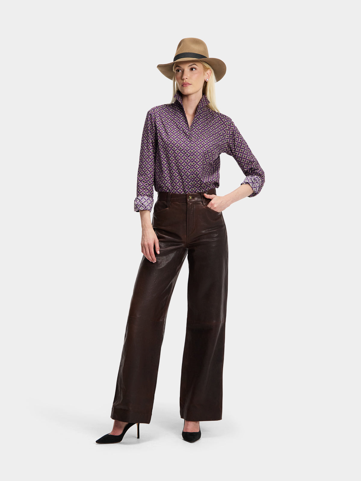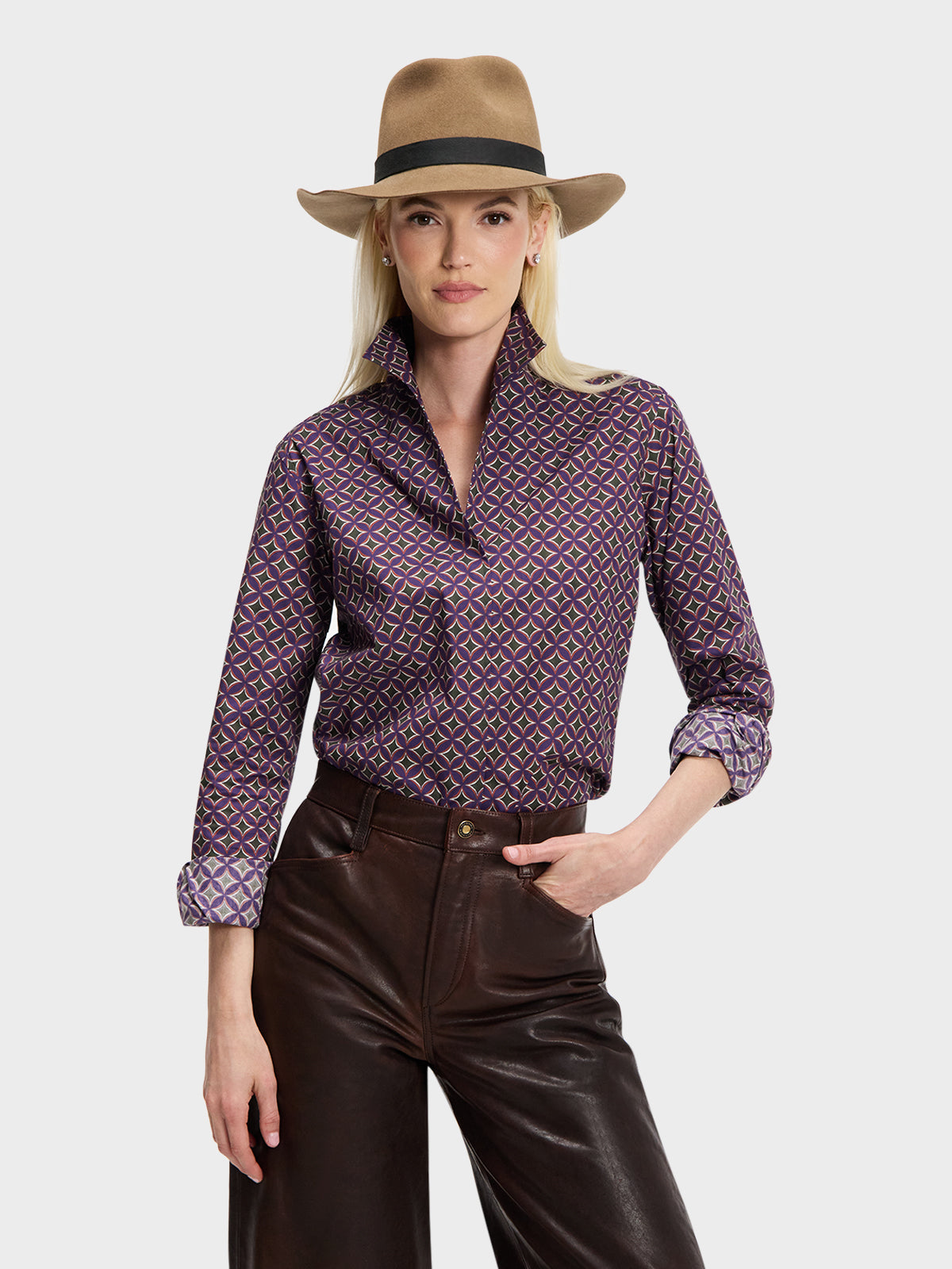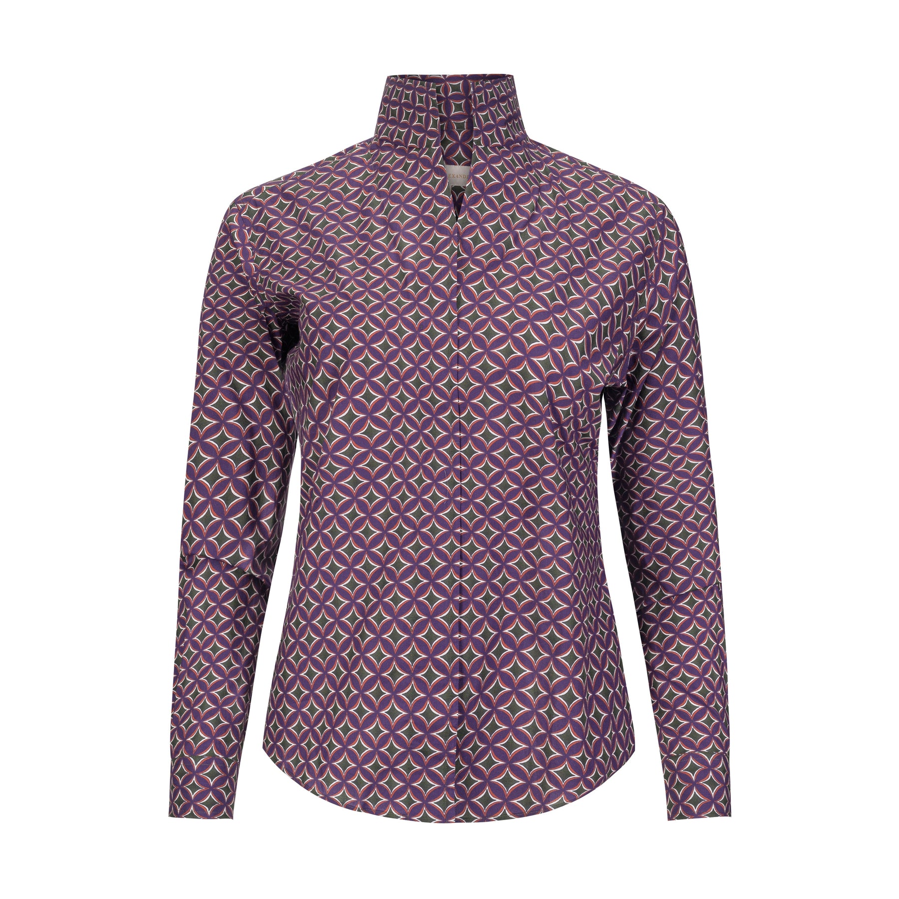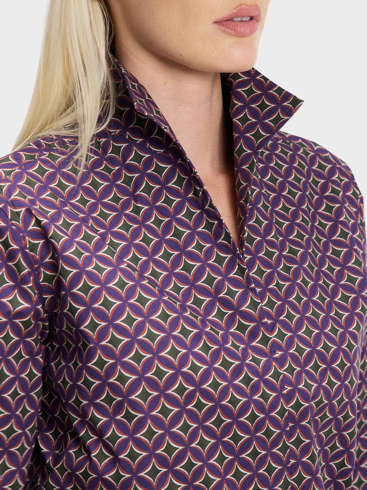 Our best-selling Signature Shirt in a purple, gold, green and white geometric print.