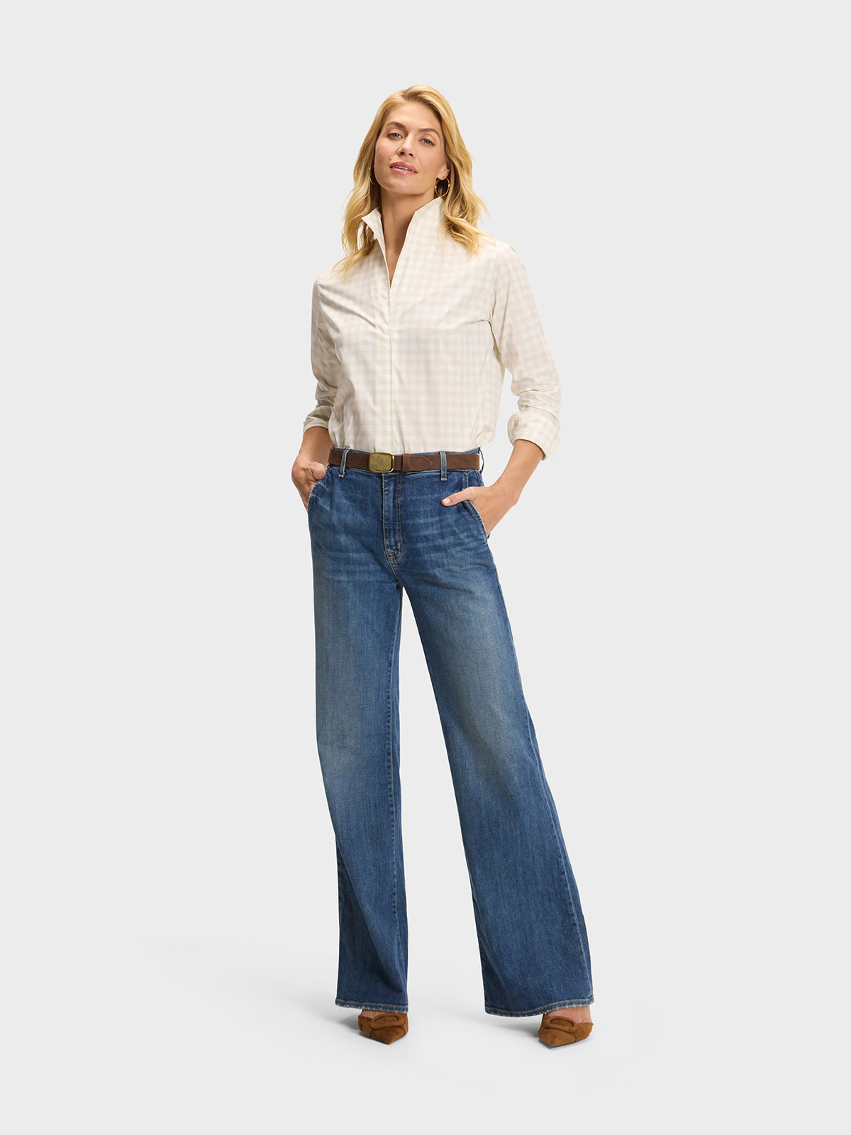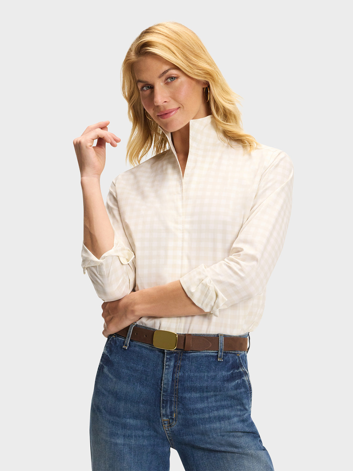 Our best-selling Signature Shirt in a sand and white gingham.